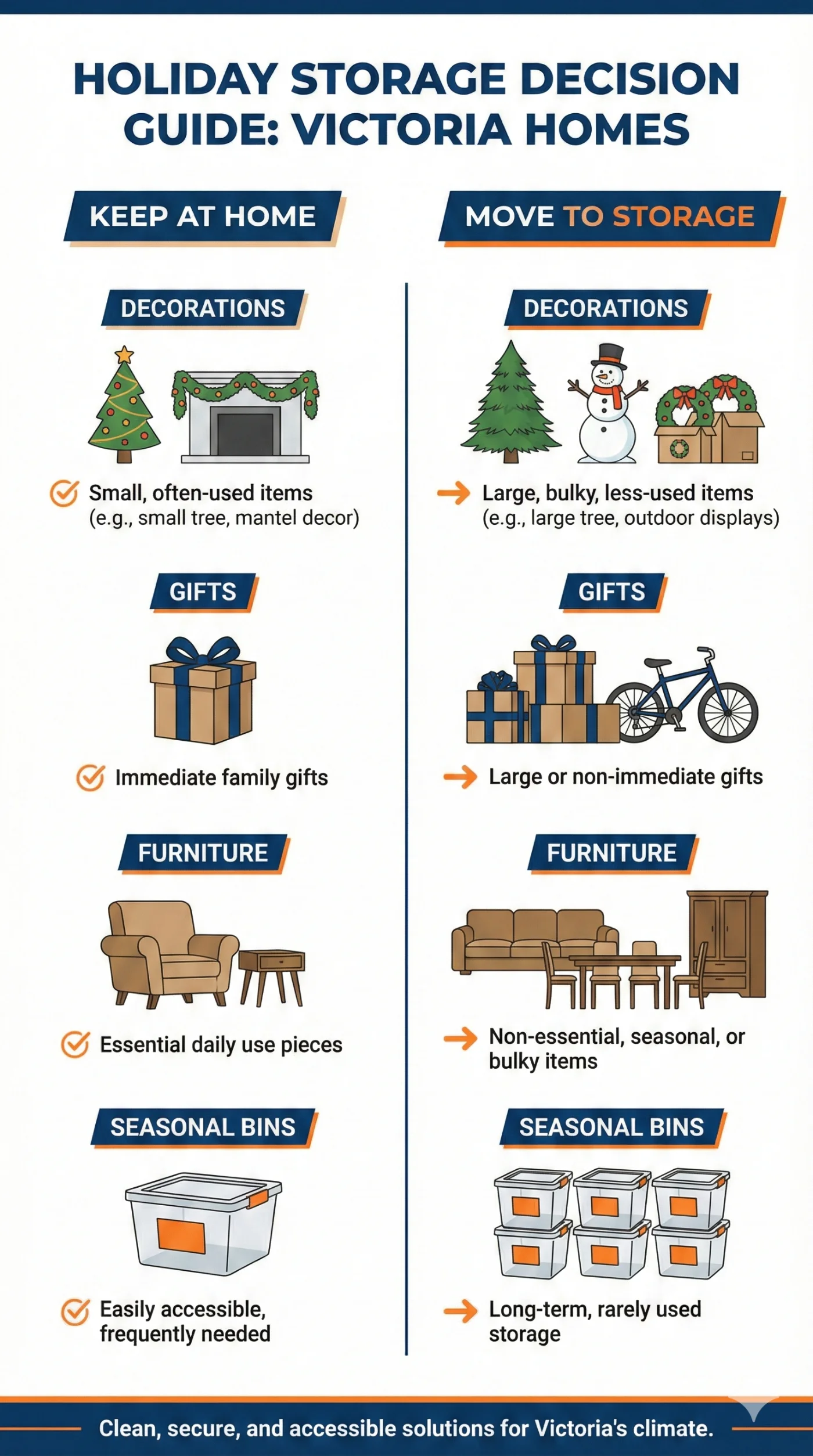 Victoria’s coastal climate brings consistent rain and humidity during the winter months. Without proper storage, holiday decorations can be damaged by moisture, mold, or rust.